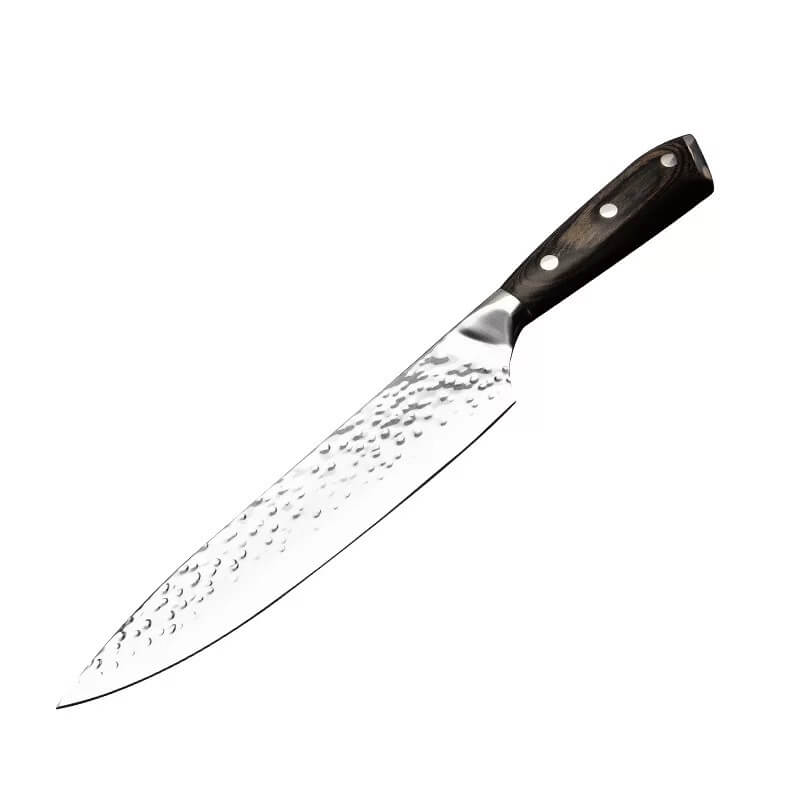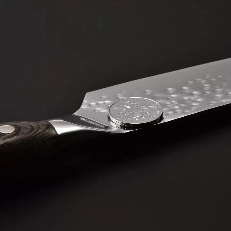 - Cán dao làm từ gỗ Pakka sang trọng, tay cầm hơi phình ở giữa giúp cầm nắm chắc chắn hơn.